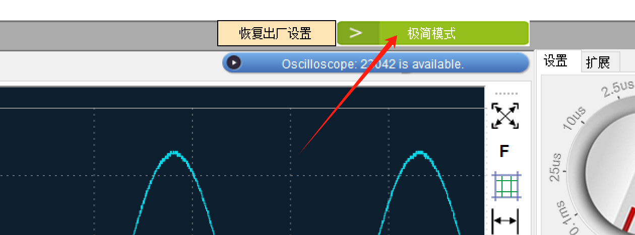 我们称之为全功能模式。在电脑上用鼠标操作这些设置其实还是很方便很快捷的。但是前提是客户已经熟练掌握了这些功能的使用。对于新手或者对示波器很多功能不太了解的客户,我们会收集到他们的一个反馈,就是觉得界面太复杂了。有些客户掌握的比较基础一些,很多LOTO示波器软件的功能暂时用不到,软件界面上的很多设置怕自己设置错了。另一些客户很熟悉示波器软件的所有功能,但是他使用的场景可能比较简单,只需要简单的功能即可,不希望显示过多的其他功能。所以我们增加了一个选项,客户可以使用极简模式,如下图所示: