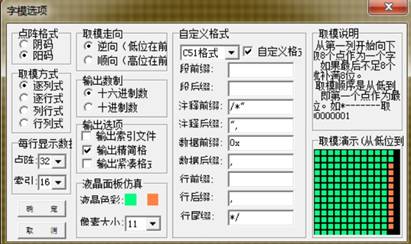 如何让一列灯不断的送数据实现一个文字的显示呢?这个我们就要了解文字取模的原理了,这里以PC2002字幕软件为例,取一个16*16的中文字,见字幕选项设置: