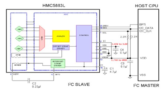 该器件可有两种不同的供电模式。第一个是内部运作的VDD供电电源,第二个是为IO接口供电的VDDIO电源,当然VDDIO的电压可以与VDD电源相近;单电源模式,或在VDDIO 电压低于VDD 的情况下,HMC5883L都能正常运作并能与其他装置兼容。