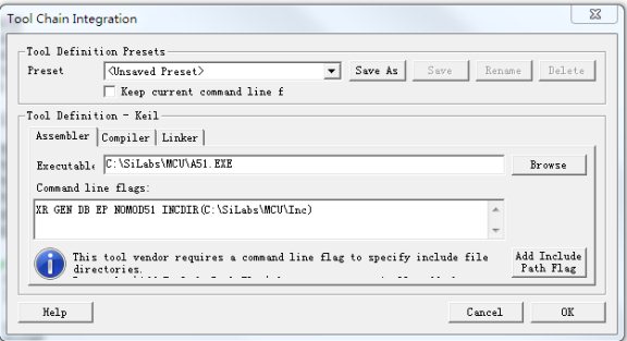 - 双击打开“Silicon Labs IDE”,选择“Project”菜单下的“Tool Chain Integration…”,出现如下界