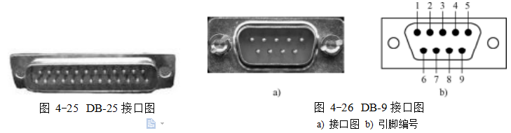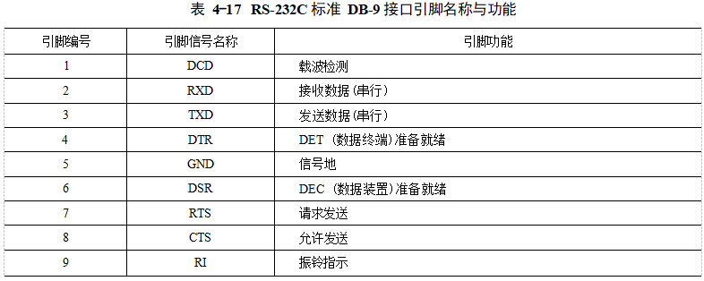 一个完整的RS-232C接口有22根线,采用标准的25芯DB-25接口(见图4-25)。目前广泛采用的是简化后的9芯DB-9接口(见图4-26),其引脚定义见表4-17。而在实际应用时,通常仅使用RXD、TXD和GND引脚。