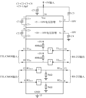 IC解密RS-232C接口标准采用负逻辑,+3~+15V为逻辑0,-15~-3V为逻辑1。TTL器件的电源电压是5V,其高电平和低电平分别约为3.4V和0.2V。CMOS器件的电源电压范围为+3~+18V,高电平接近电源电压,低电平接近0V。因此,RS-232C接口电平与TTL电平及CMOS电平不兼容,需要进行电平转换后才能相连。常用的TTL与RS-232C电平的转换芯片是MAX232,其引脚和内部逻辑功能如图4-27所示。